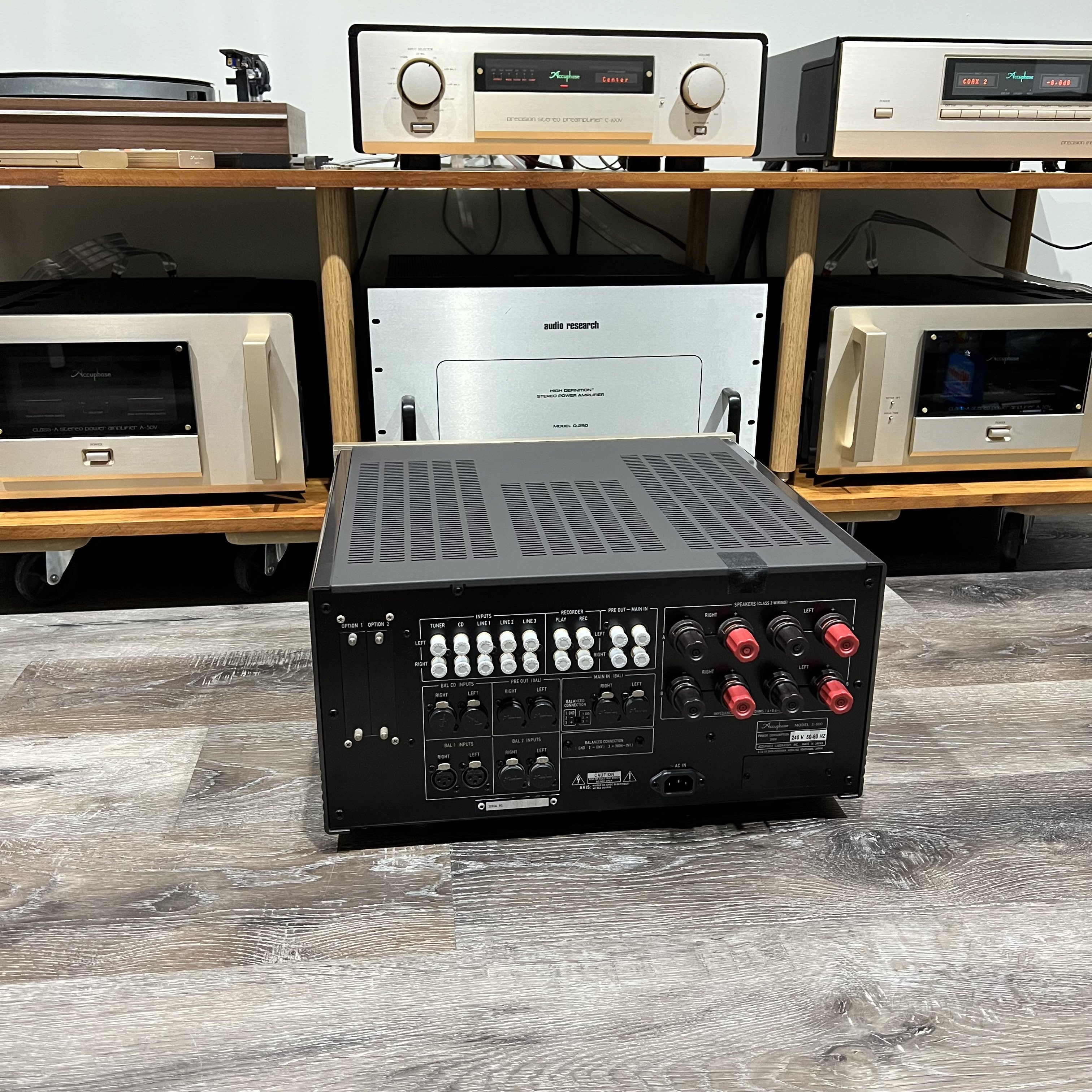 All new 50th anniversary E-800 takes its place alongside the C-3850, A-250 and DC/DP-950 as the flagship model in line up of accuphase. Produces 50 watt into 8ohm and 300 watt down to 1ohm of clean class A power per channel, and high damping factor of 1000 this amp can easily unlock full potential of most speakers. Weighs 45kg with box.
