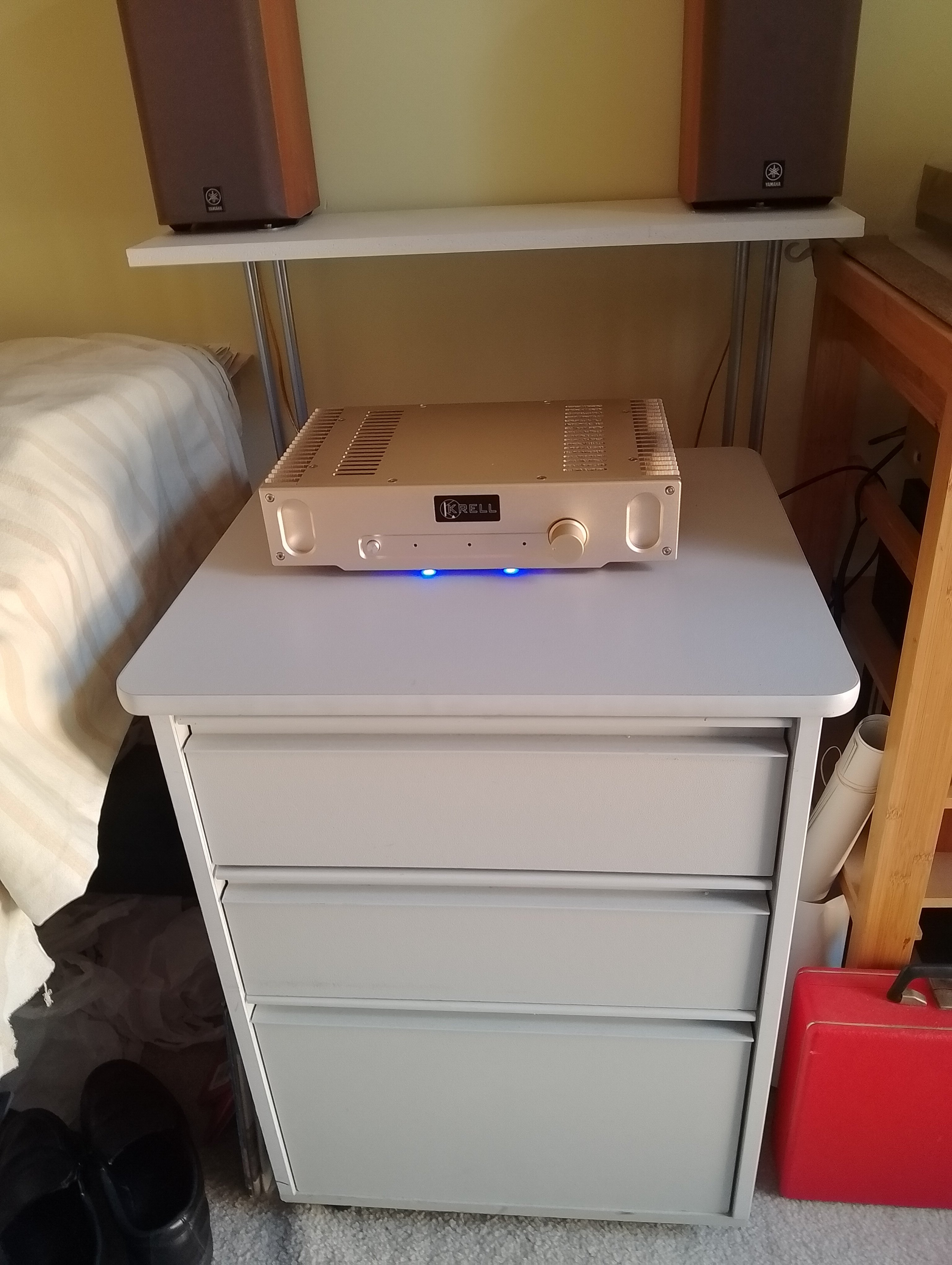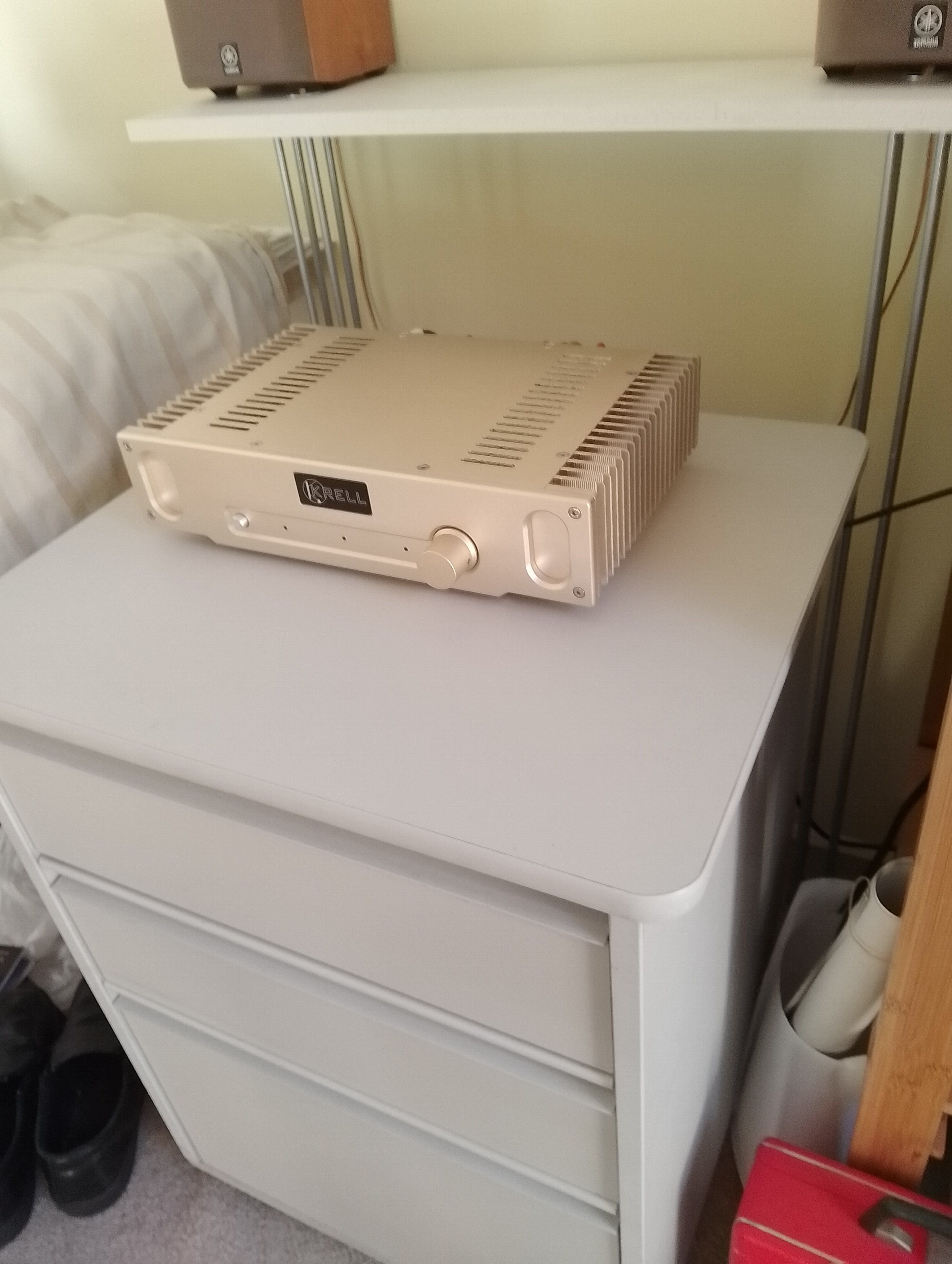 Greetings to all. This nice amplifier is based on a Class A circuit developed by John Lindsay Hood in the U.K. back in 1969 and is still being used today. It has a lovely natural sound quality and although rated at only 2 x 10 watts it works extremely well with my Dali stand mount speakers – 87db 8ohms. There is only 1 set of inputs so this is a power amp with volume control. When I first switched the amp on I noticed that it had 2 bright blue LED’s on the front panel which were too bright for me so they were reinstalled into the front of the bottom plate as shown in the picture. This amp is in mint condition and perfect working order. KRELL badge on front. Specs: H 80 - W 340 - D 210. Demo available if you live within driving distance. A power lead will be supplied. Postage will be standard post with tracking number. Cheers – M.