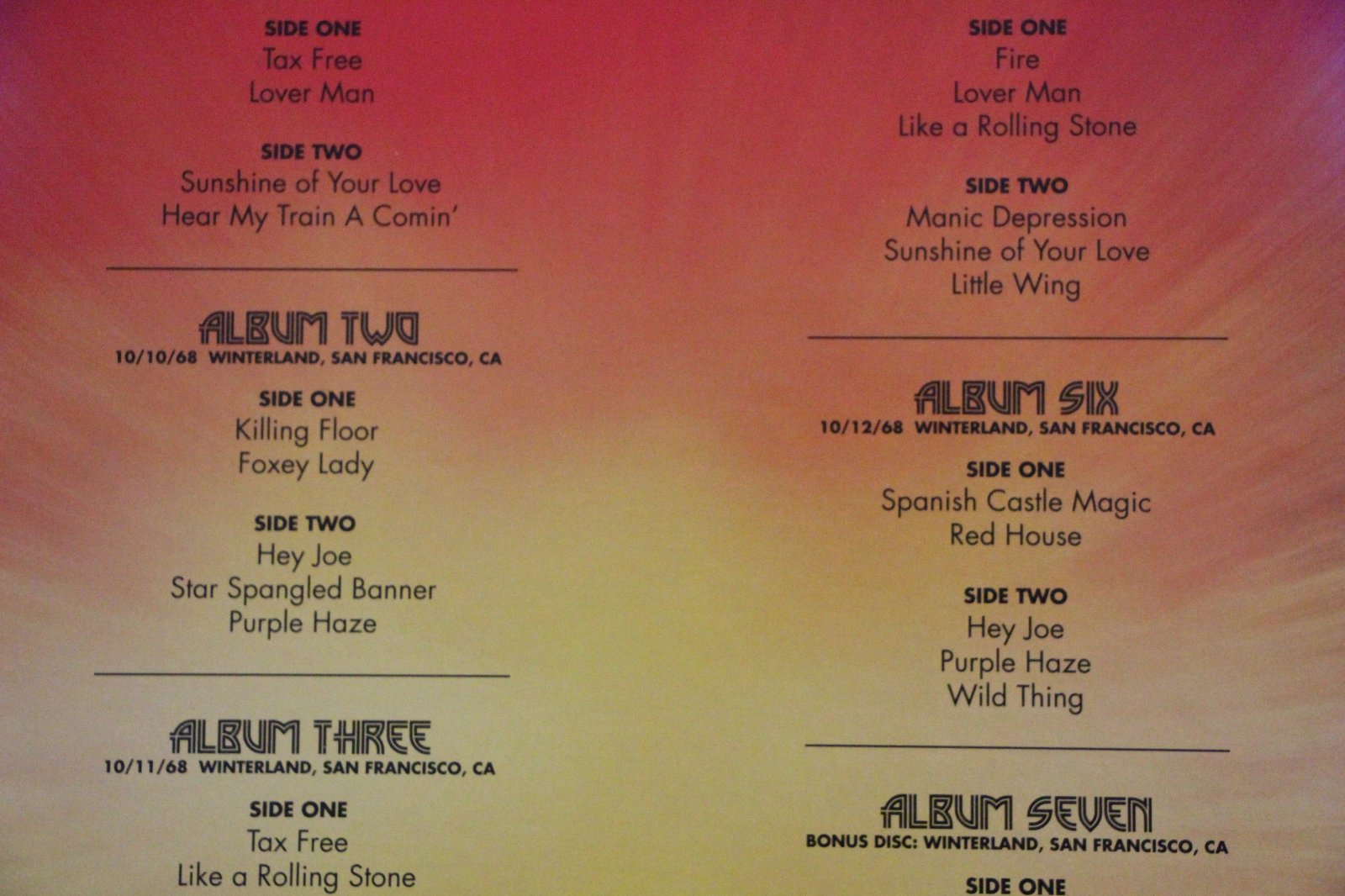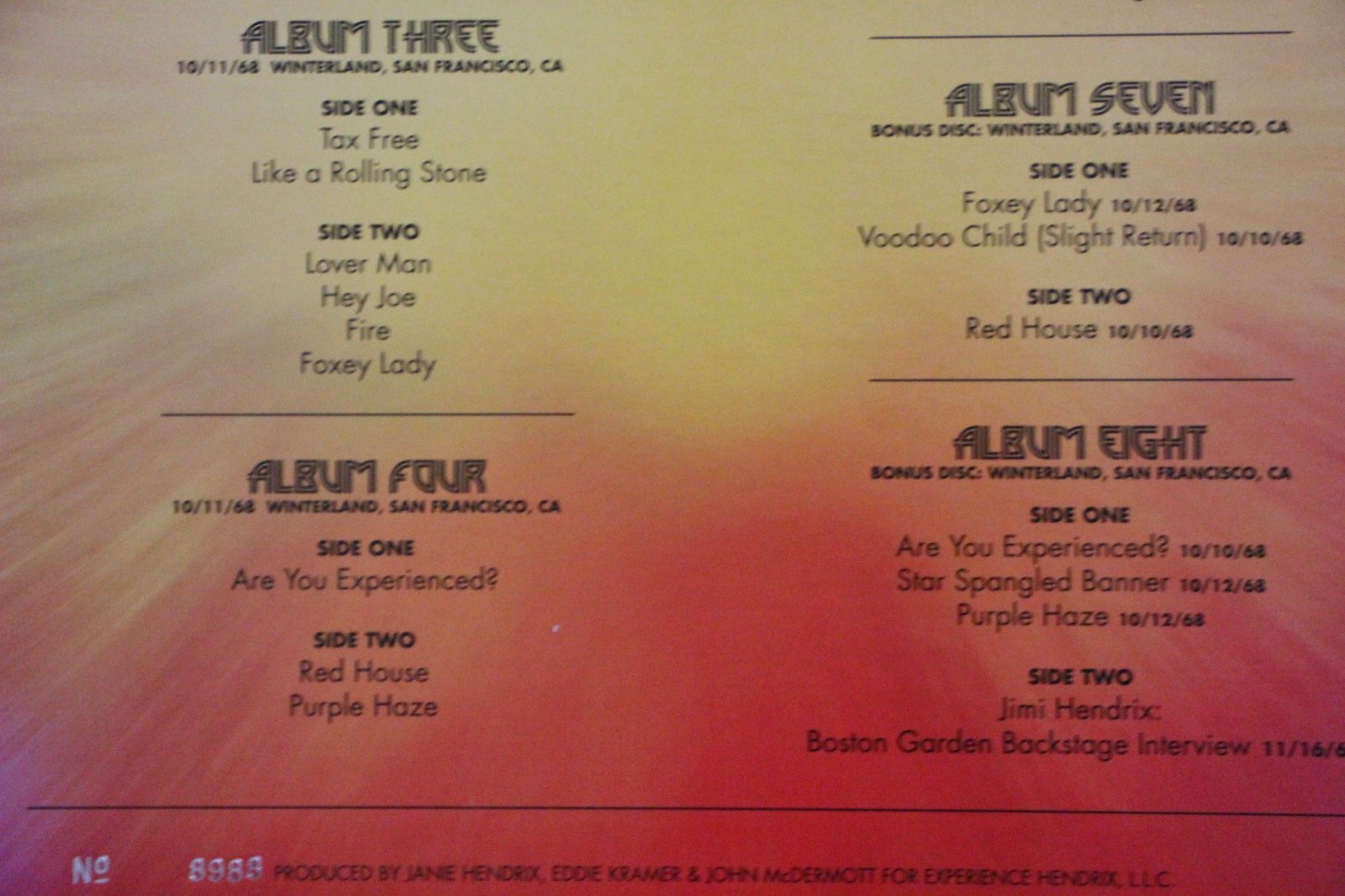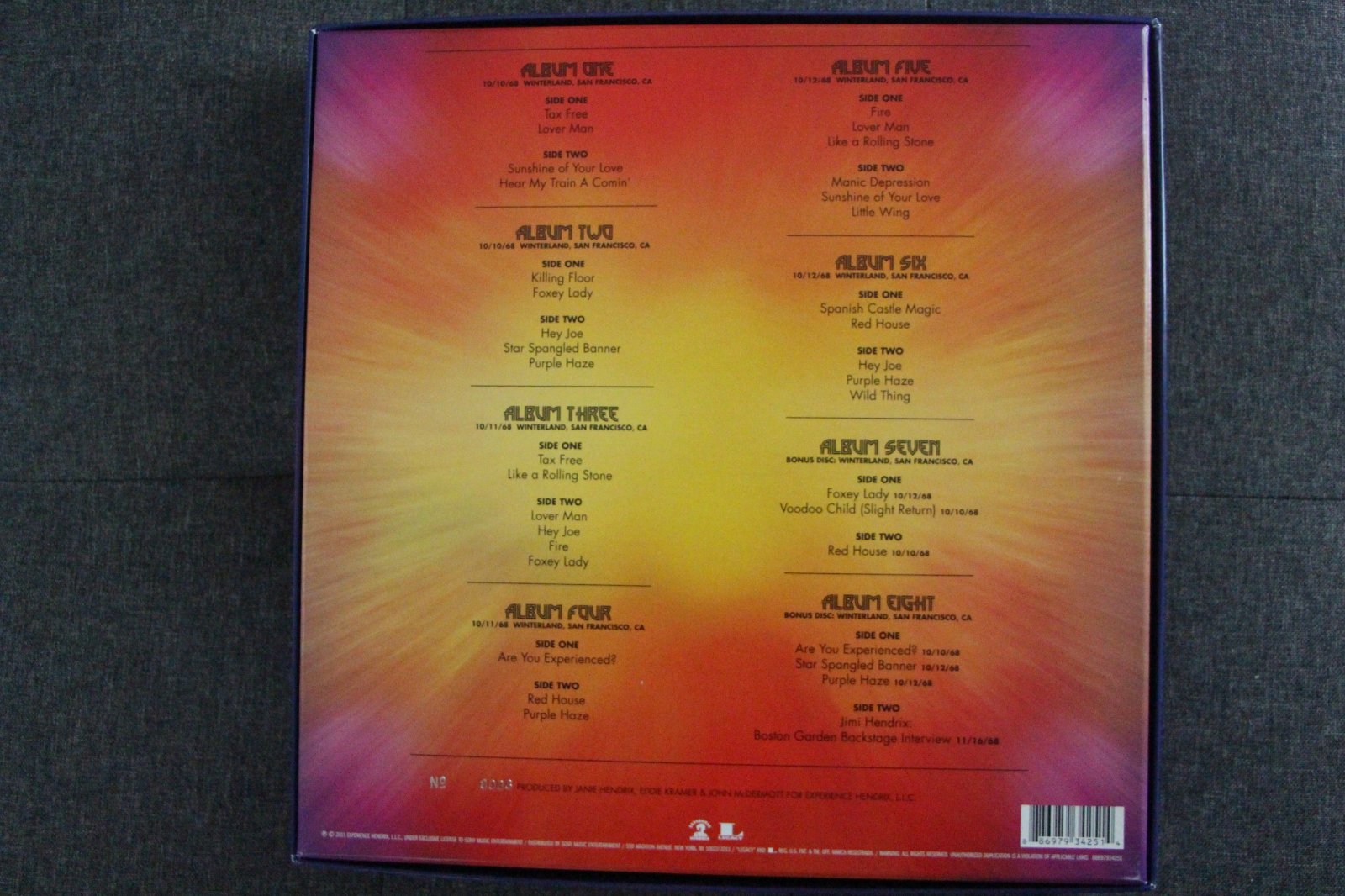Jimi Hendrix-Winterland . 8 x 180 gram LP's and booklet in a Top Lift Box. All LP's come in individual Picture Sleeves , Released in 2011 , this Numbered Limited Edition set has long been Out Of Print. I played it through once when I bought it , but it's just been in storage ever since.