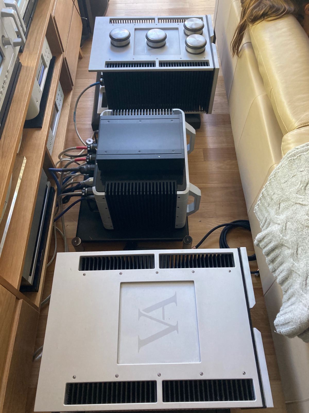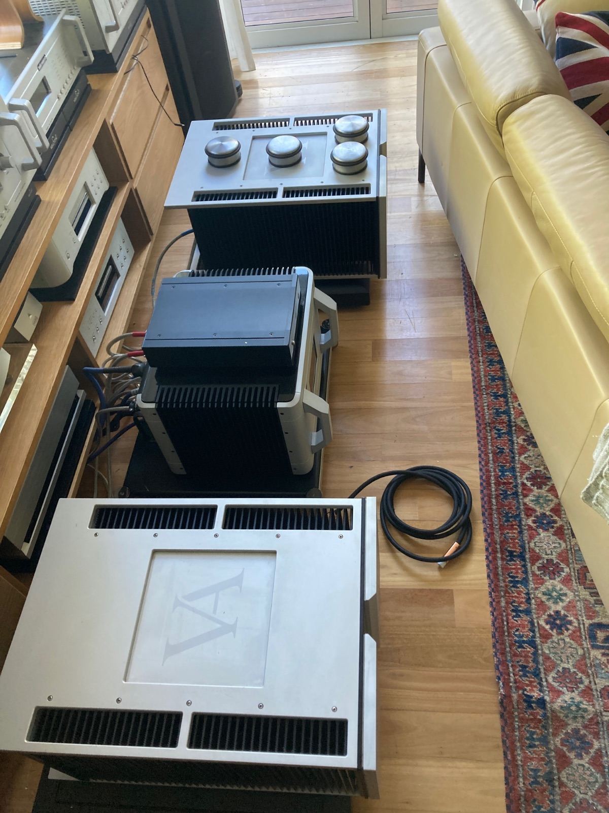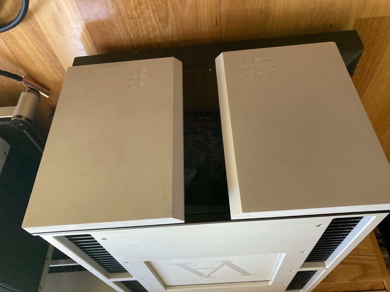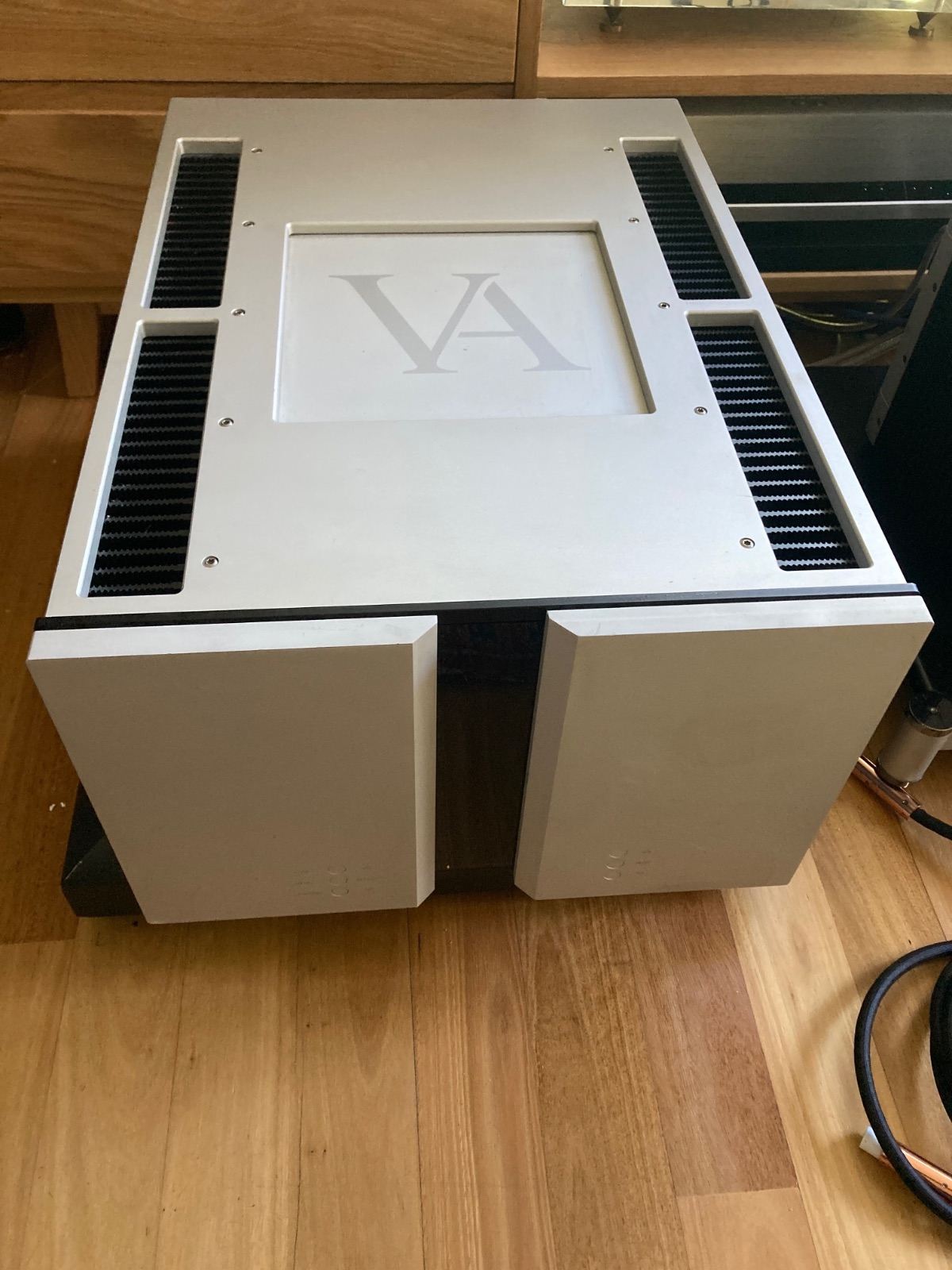 Mono Blocks Sonically 10-10 - undercarriage and edges have a few scrapes. they are hard work to move around on your own at 74 kilos each and have got some scratches on bottom panel and bottom edges. normal surprise but just mentioning it. Last negative one foot missing on one amp still sits on 3 and have other to offer in the missing ones place.